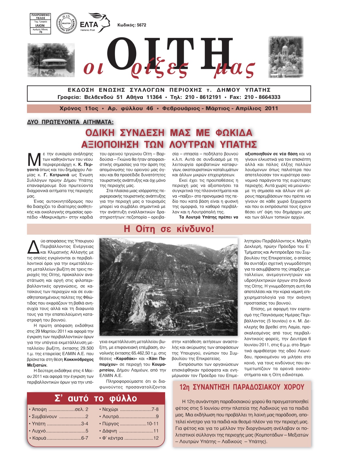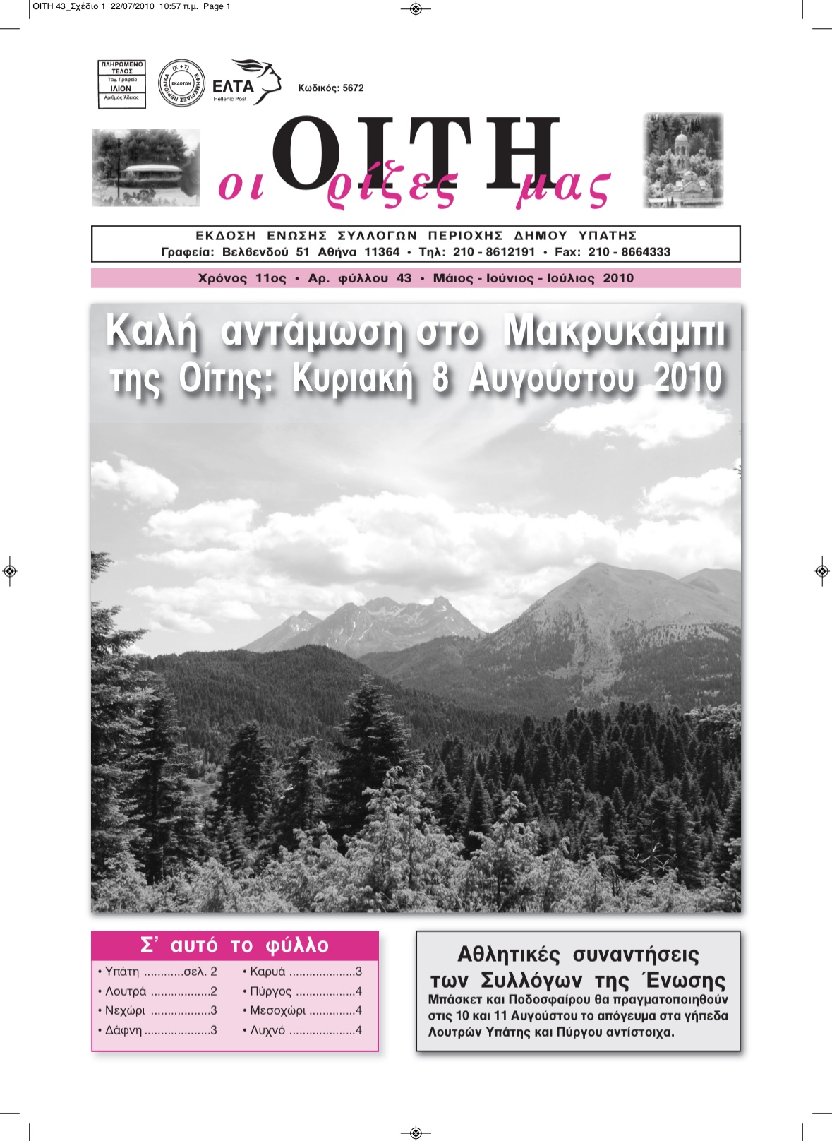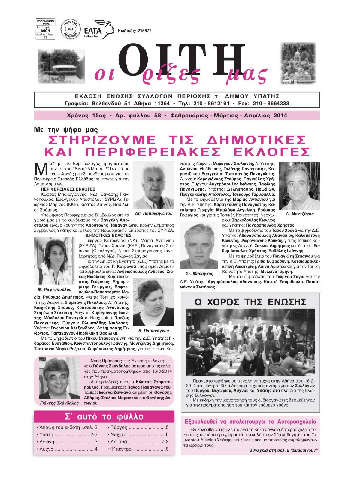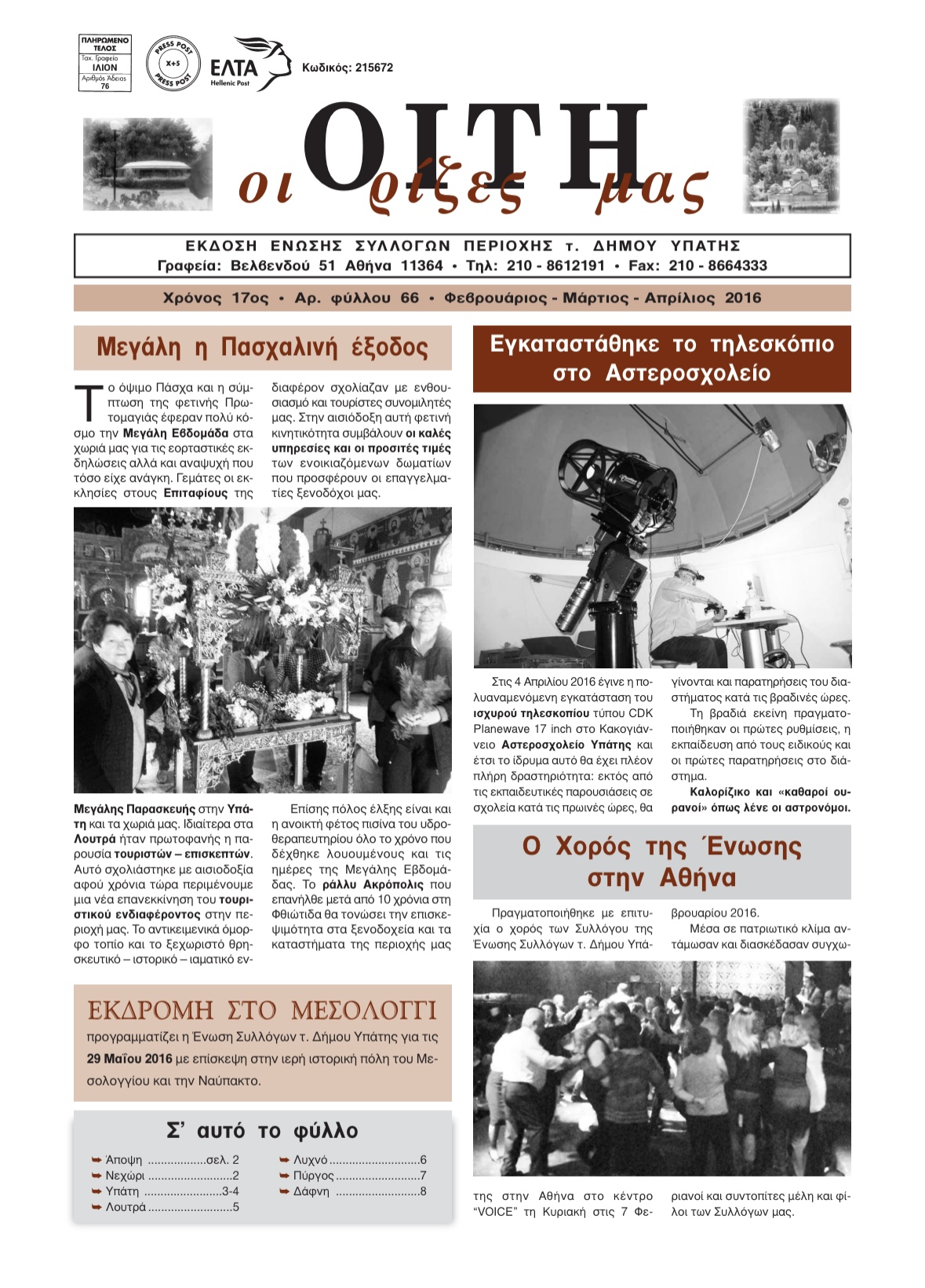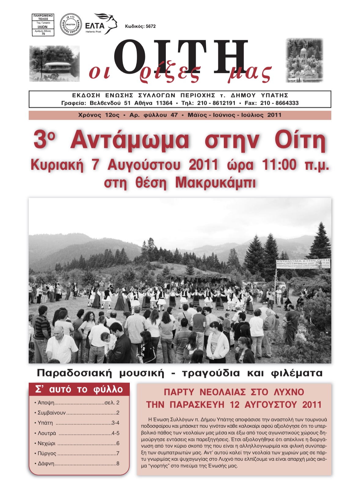 Διαβάστε ή κατεβάστε την τριμηνιαία έκδοση της ένωσης των συλλόγων της περιοχής μας, με νέα από το χωριό μας αλλά και από τα γύρω χωριά του Δήμου Υπάτης. Η Εφημερίδα δεν βρίσκεται σε κυκλοφορία πια.
