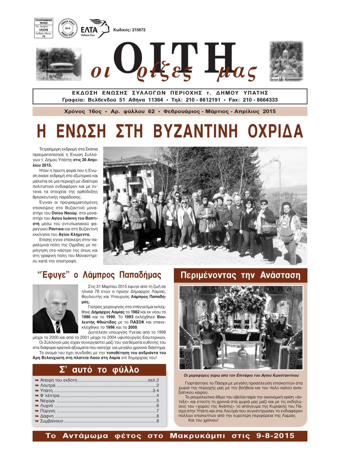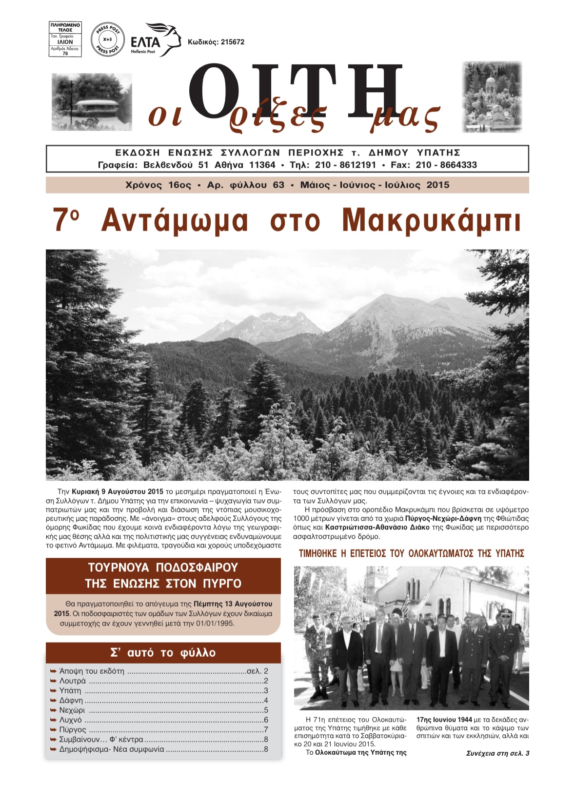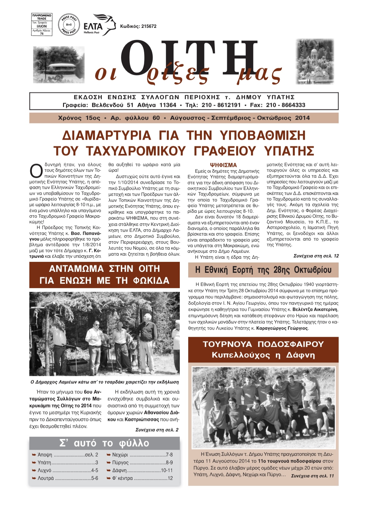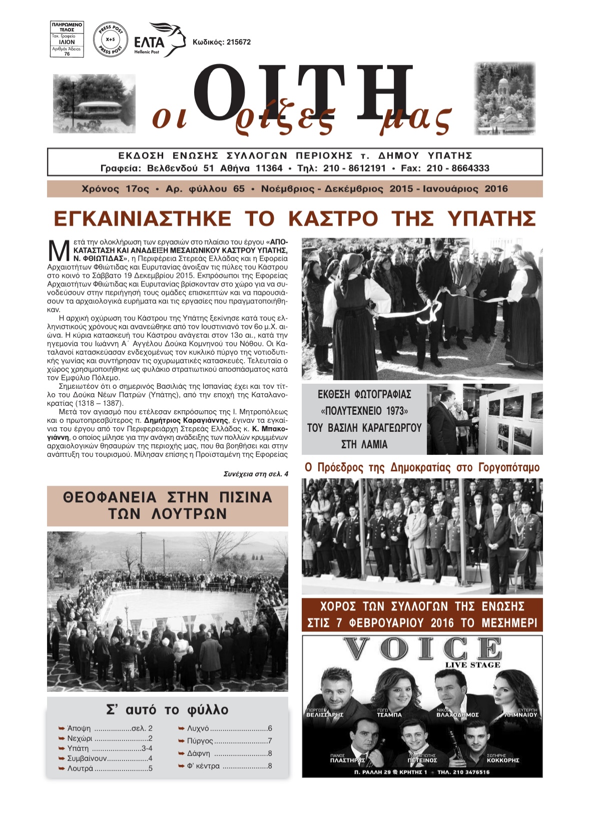 Διαβάστε ή κατεβάστε την τριμηνιαία έκδοση της ένωσης των συλλόγων της περιοχής μας, με νέα από το χωριό μας αλλά και από τα γύρω χωριά του Δήμου Υπάτης. Η Εφημερίδα δεν βρίσκεται σε κυκλοφορία πια.