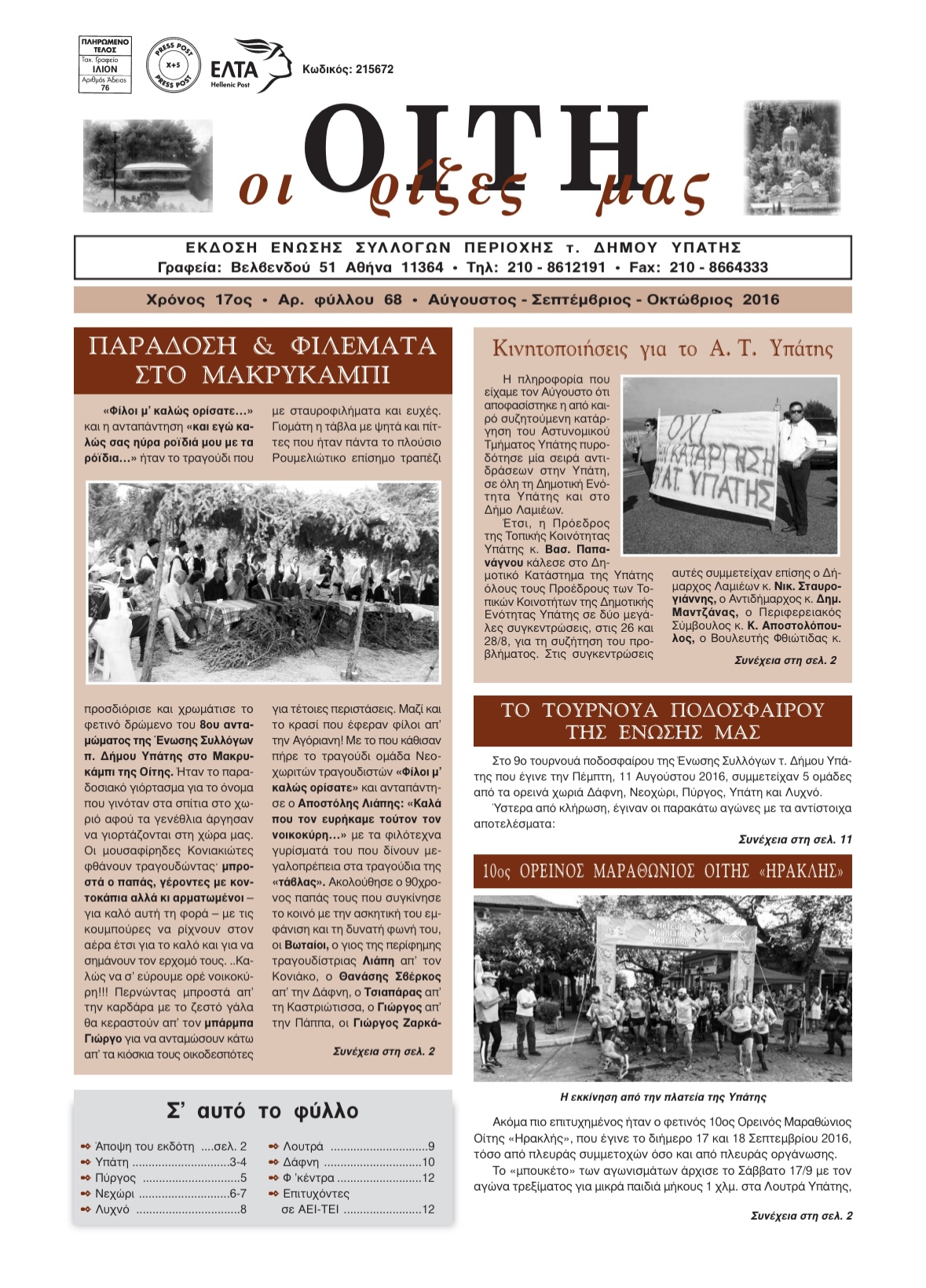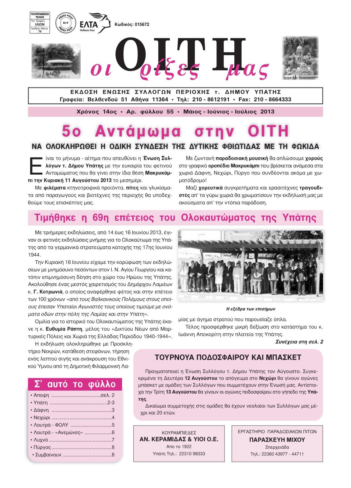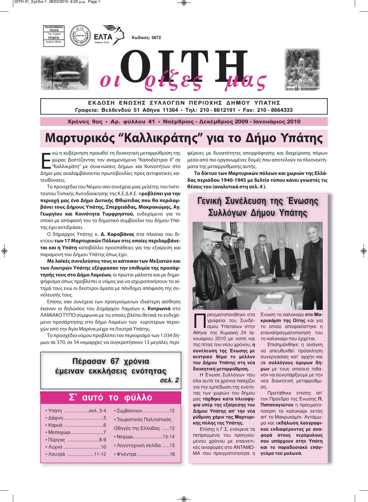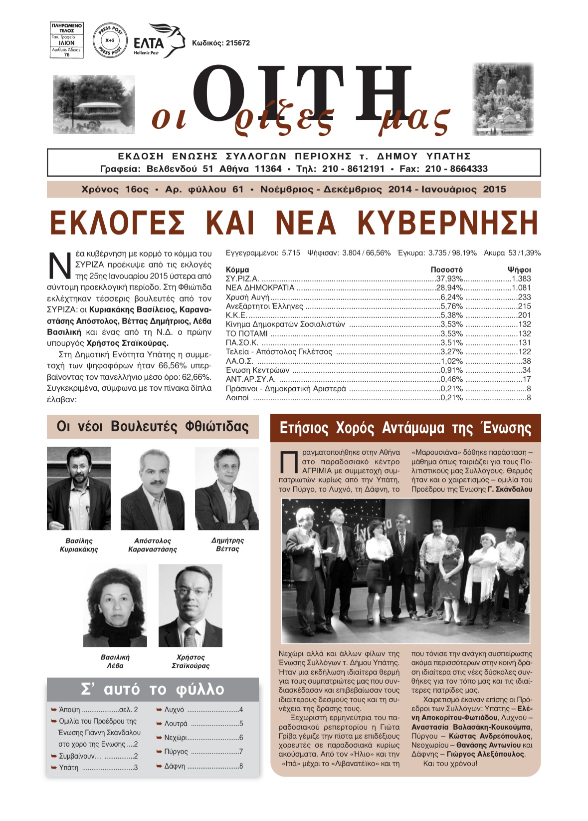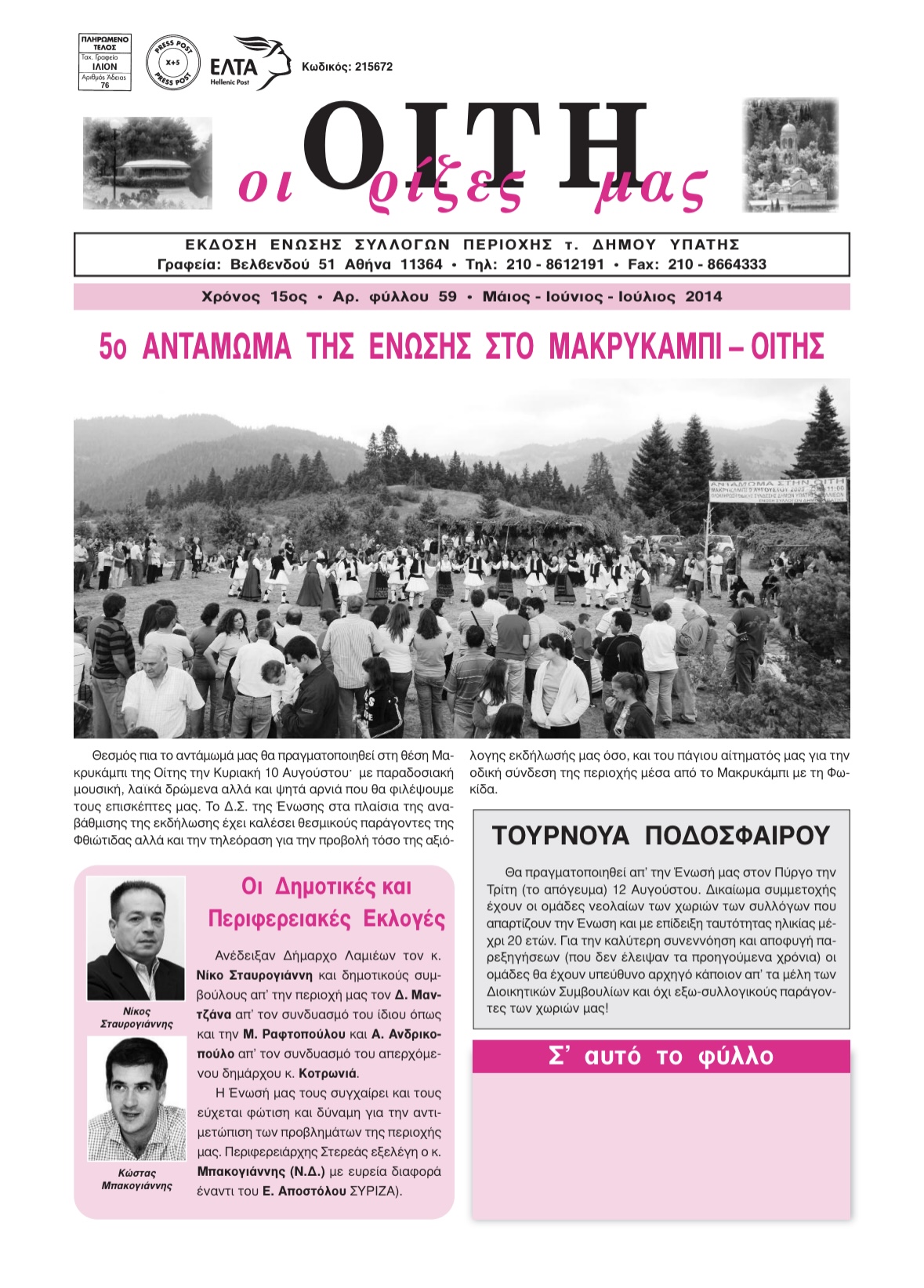 Διαβάστε ή κατεβάστε την τριμηνιαία έκδοση της ένωσης των συλλόγων της περιοχής μας, με νέα από το χωριό μας αλλά και από τα γύρω χωριά του Δήμου Υπάτης. Η Εφημερίδα δεν βρίσκεται σε κυκλοφορία πια.