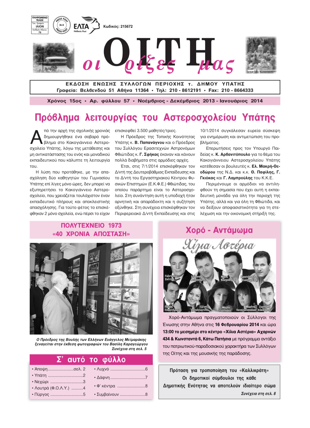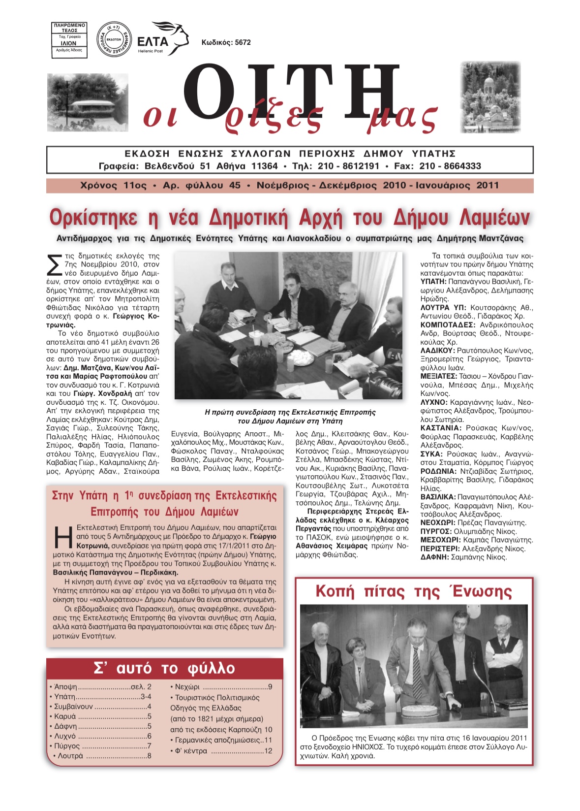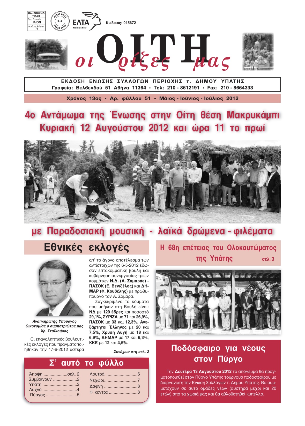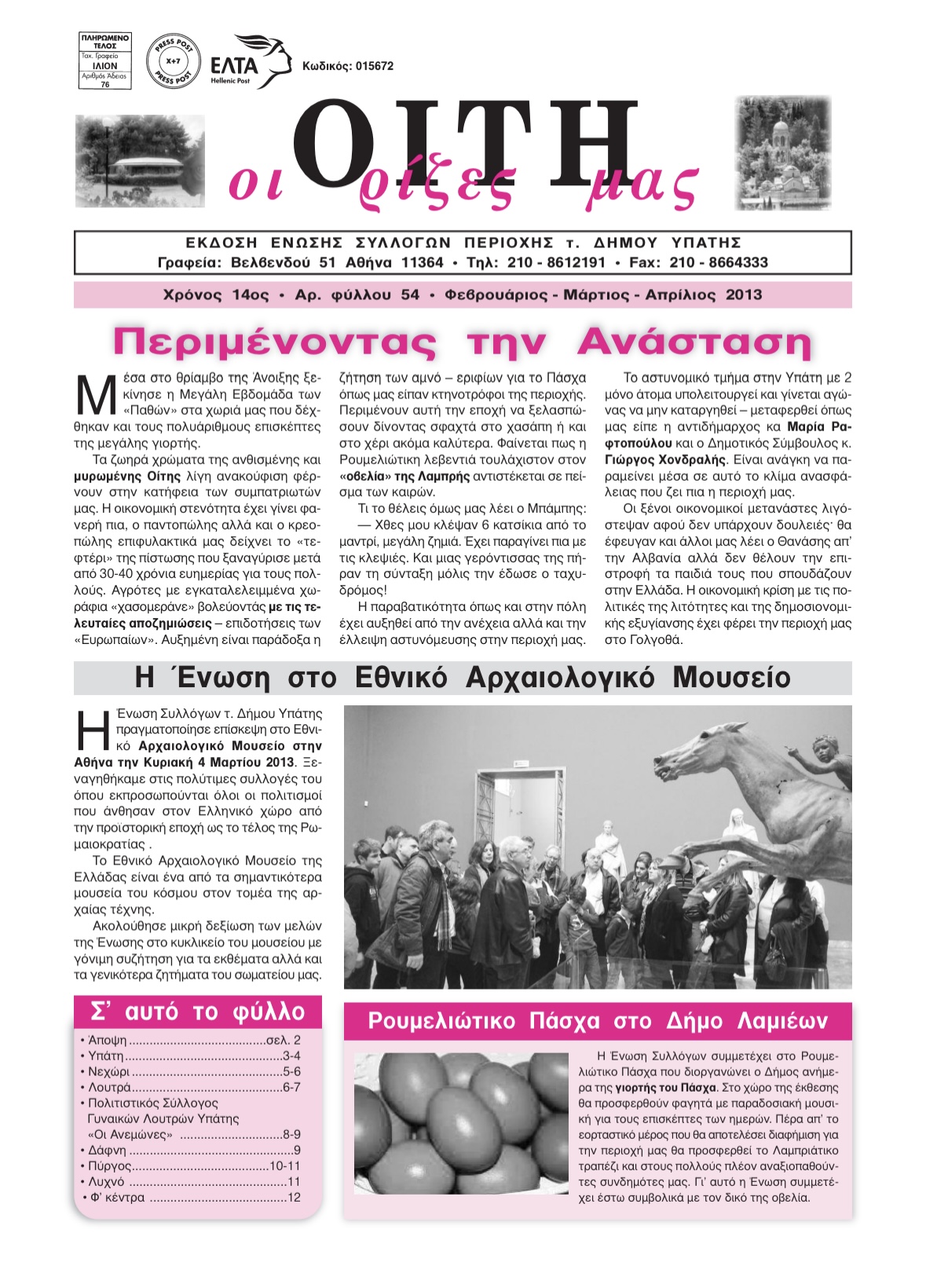 Διαβάστε ή κατεβάστε την τριμηνιαία έκδοση της ένωσης των συλλόγων της περιοχής μας, με νέα από το χωριό μας αλλά και από τα γύρω χωριά του Δήμου Υπάτης. Η Εφημερίδα δεν βρίσκεται σε κυκλοφορία πια.